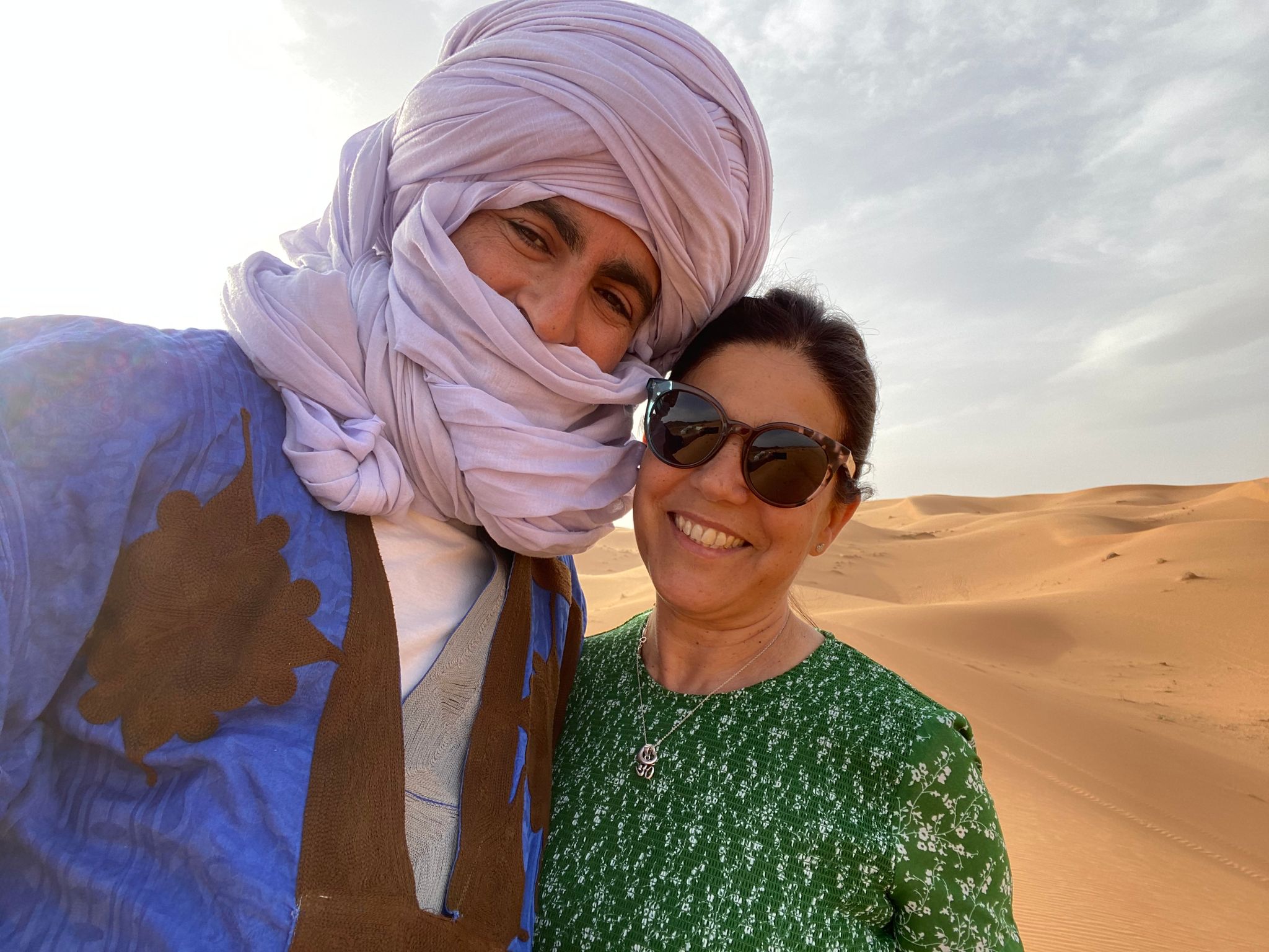 Se ripenso ora al nostro primo incontro, posso dire che è stato amore a prima vista, un classico colpo di fulmine. Lui è arrivato indossando la gandora bianca (tipico abito del deserto), un turbante nero e un chiodo in pelle. Aveva la bocca coperta ed io vedevo solo gli occhi, bellissimi e resi ancora più profondi dal kajal, che qui nel deserto viene utilizzato per proteggere gli occhi dal riverbero del sole sulle dune. Sono poi tornata in Marocco a febbraio, ad aprile, a giugno, in estate… insomma, nel 2012 sarò venuta qui 8 volte. Appena avevo un attimo, correvo in Marocco. Ci siamo scritti su WhatsApp e ci siamo tenuti in contatto. La relazione è andata avanti così, a distanza, per 7 anni. A lui, purtroppo, né l’Italia e né la Svizzera, dove abitavo dal 2009, hanno mai dato il visto, quindi, ero sempre io a venire, con una frequenza di almeno 7/8 volte l’anno.