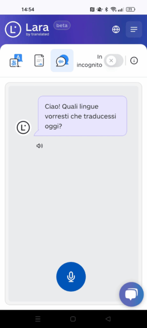 In più, con Lara Interpreter puoi affrontare conversazioni reali parlando solo in italiano: sarà Lara a tradurre per il tuo interlocutore. Ideale per chi è in movimento e ha bisogno di conversare con le persone del posto.