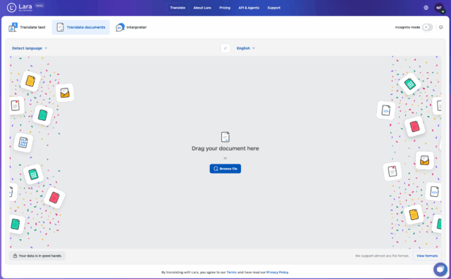 Con strumenti come Lara Translate puoi tradurre interi documenti in pochi secondi, senza perdere il layout e con la possibilità di rilevare eventuali ambiguità.