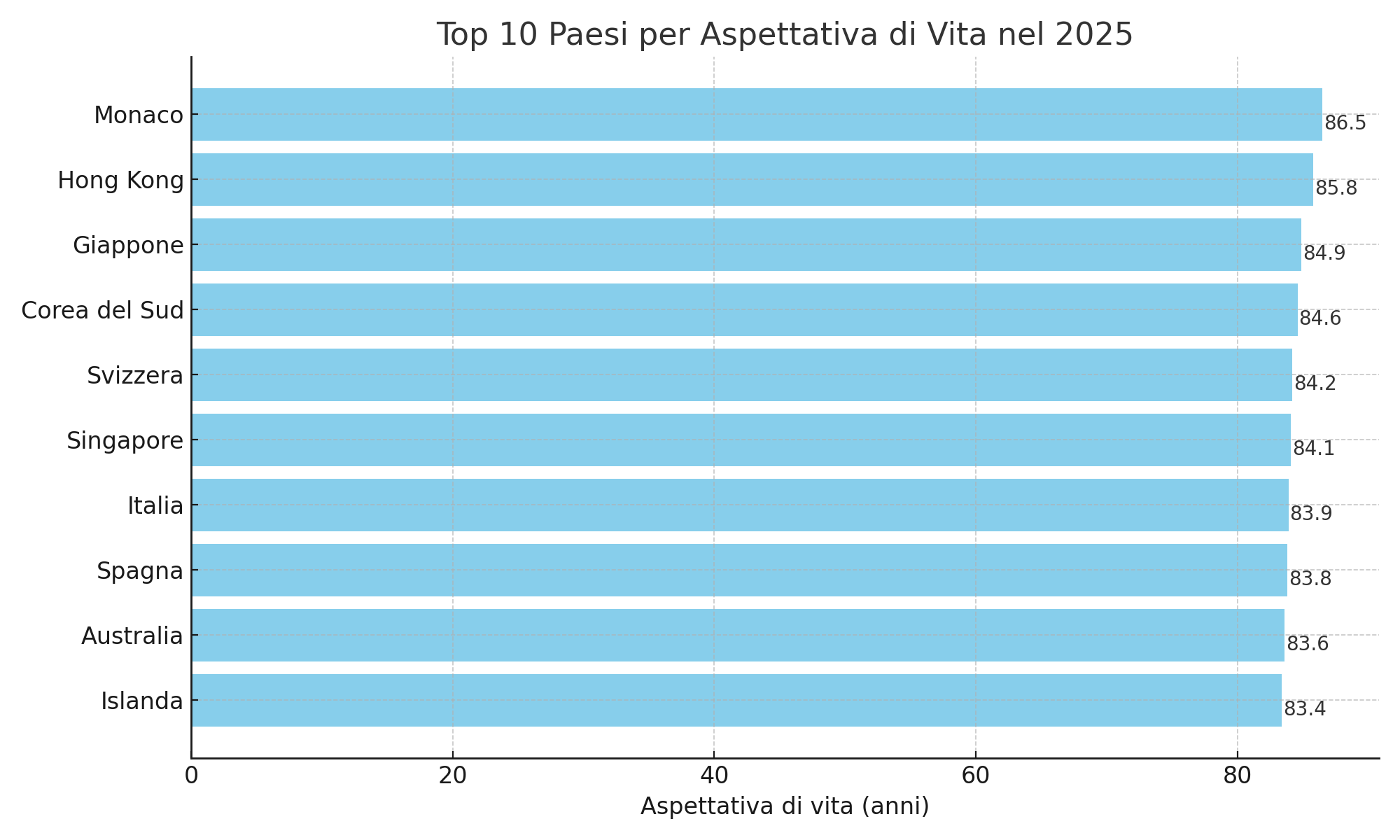 Secondo i dati aggregati da Worldometer, Visual Capitalist, WHO e altri istituti demografici, i seguenti paesi mostrano la più alta aspettativa di vita: